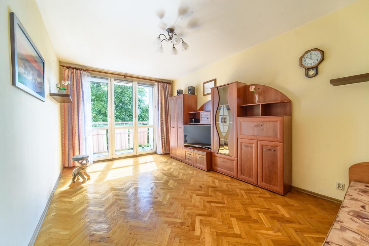 Pokój (18,5m2) z wyjściem na balkon. Trzy skrzydłowe okno, na podłodze ładny parkiet dębowy.