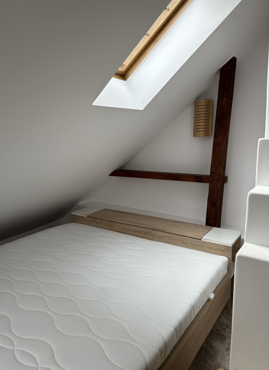 Na jego pierwszym poziomie znajdziemy otwartą przestrzeń, w której jest aneks kuchenny, miejsce na wypoczynek oraz pracę, a także łazienkę. Drugi poziom to przestrzeń do własnej aranżacji, w której z powodzeniem zmieści się strefa snu, pracy oraz przechowywania. Dodatkowe okna połaciowe doskonale doświetlają poddasze.