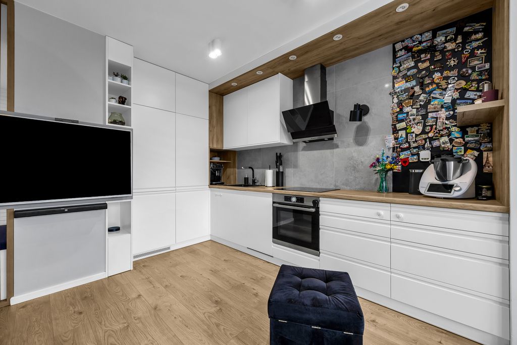 Do mieszkania przynależą również 2 balkony (4,64 m2 i 4,48 m2), na które znajduje się wyjście z obu pokoi i salonu. Lokal został urządzony w sposób przytulny, nowoczesny i bardzo funkcjonalny. Liczne zabudowy stolarskie wykonane na wymiar zapewniają dużą ilość miejsca do przechowywania, jednocześnie zachowując estetykę i porządek we wnętrzu.