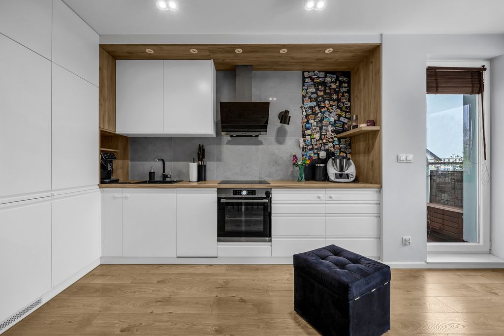 - ustawny salon z aneksem kuchennym z wyjściem na balkon,