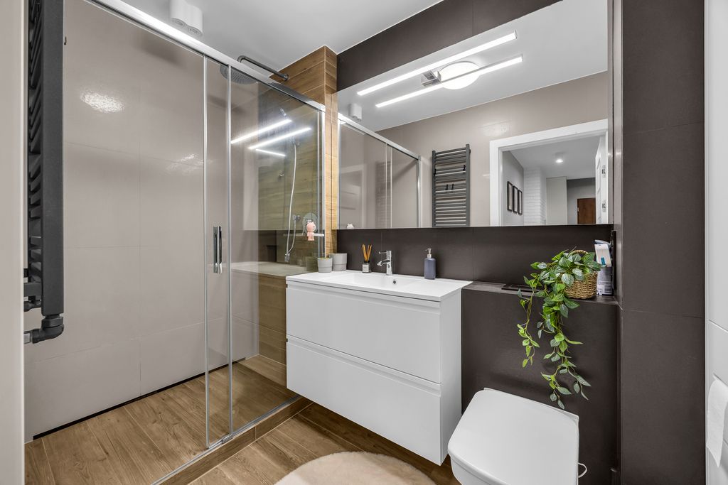 - łazienka, z kabiną prysznicową, wykończona w neutralnej kolorystyce,