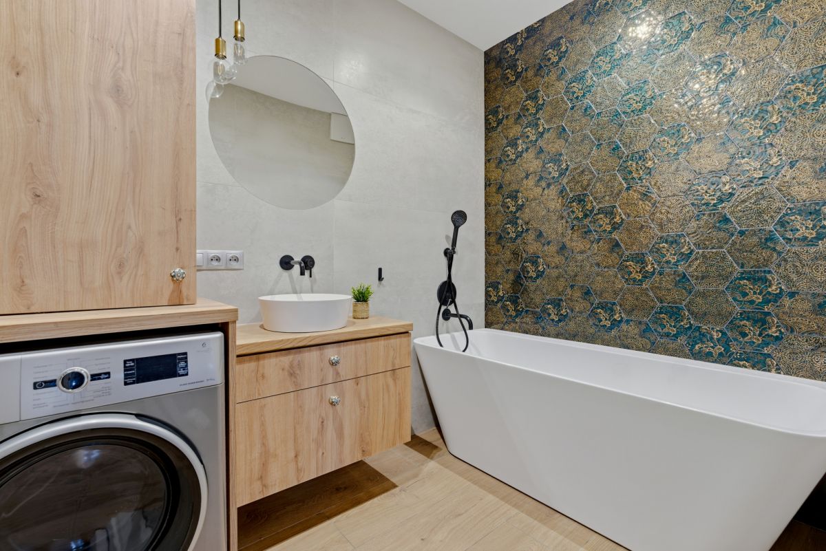 Mieszkanie posiada łazienkę z wanną i pralką oraz osobną toaletę, co podnosi komfort mieszkańców. Funkcjonalny hol z zabudową na wymiar oferuje dodatkową przestrzeń do przechowywania.