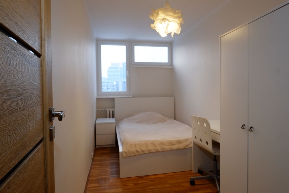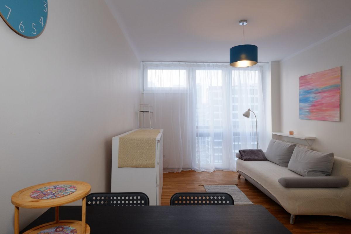 Mieszkanie znajduje się na XIV piętrze, co zapewnia widok na nowoczesną panoramę Śródmieścia i Woli, a jednocześnie ciszę i prywatność - rzadkie połączenie w tej lokalizacji.