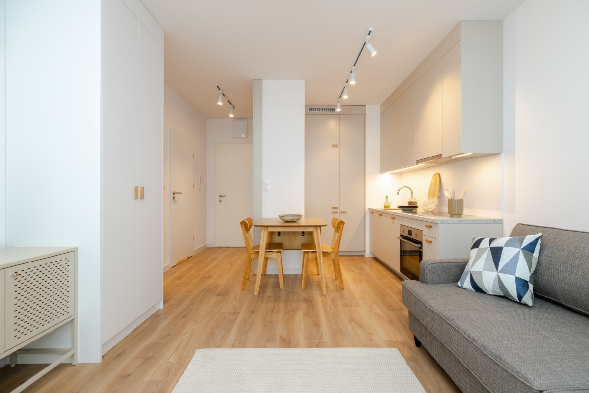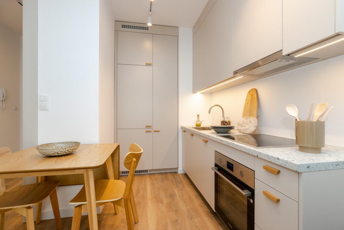 Mieszkanie jest bardzo dobrze doświetlone dzięki dużym oknom oraz położeniu na ósmym piętrze, a przemyślane rozmieszczenie zabudowy zapewnia komfort i funkcjonalność.