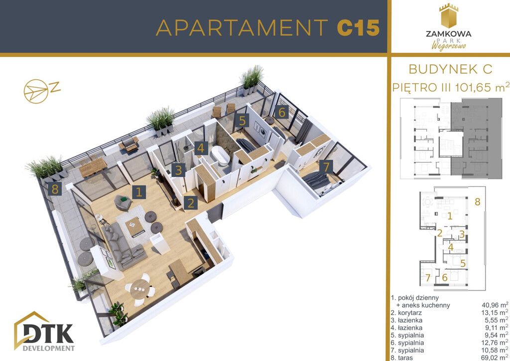 Penthouse 101,65 m² z dwoma łazienkami z wyjściem na taras i 69 m² zewnętrznej przestrzeni. Jedna z najmocniejszych ofert w Zamkowa Park. Umów prezentację.