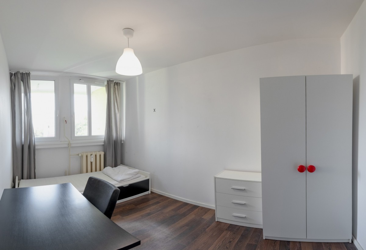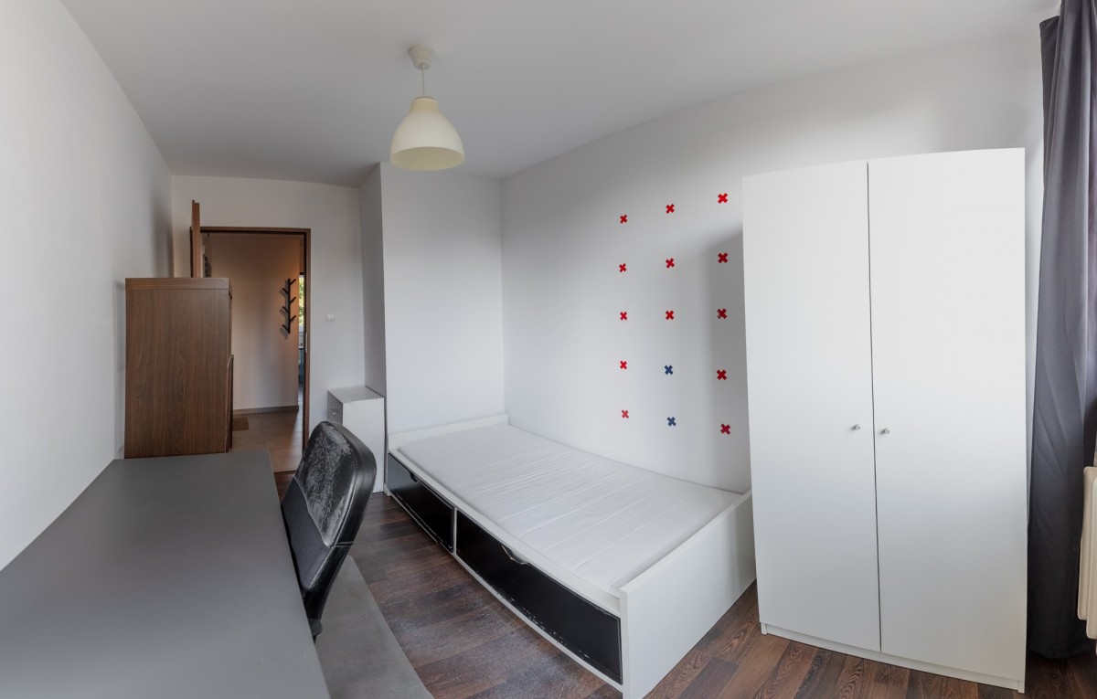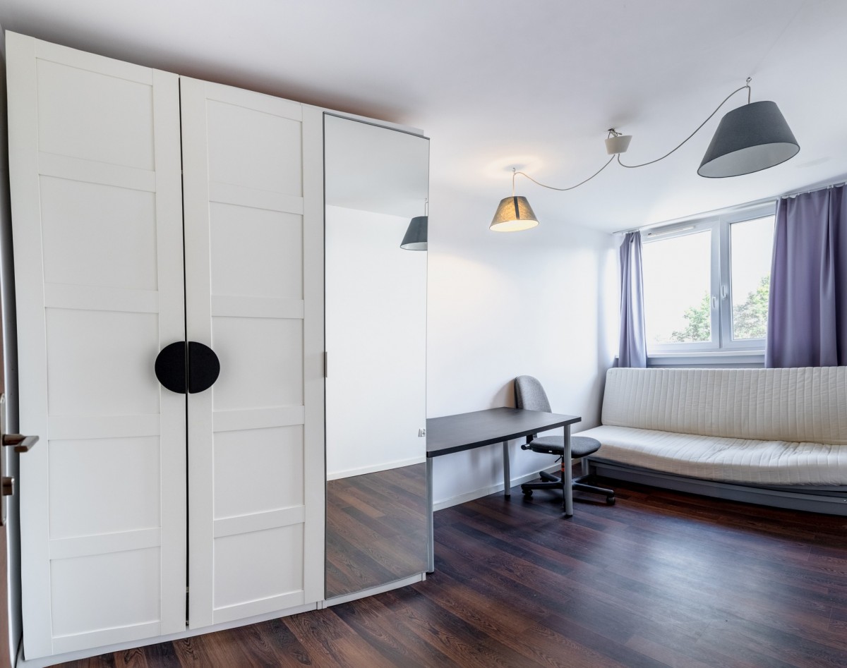 Full equipment: Three rooms are equipped with practical furniture: a bed with drawers, a wardrobe, a shelf unit, a desk, a dresser, and a small table. The fourth room offers even more space with a large 3-door wardrobe, a spacious dresser, and a sofa bed for two people. The apartment also includes a washing machine, refrigerator, electric hob with oven, microwave, complete kitchen and bathroom units, and two shoe cabinets in the hallway. Additionally, the equipment includes cutlery, dishes, pots, glasses, a drying rack, a vacuum cleaner, and a kettle.