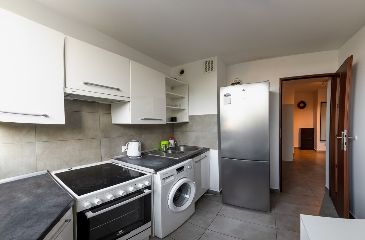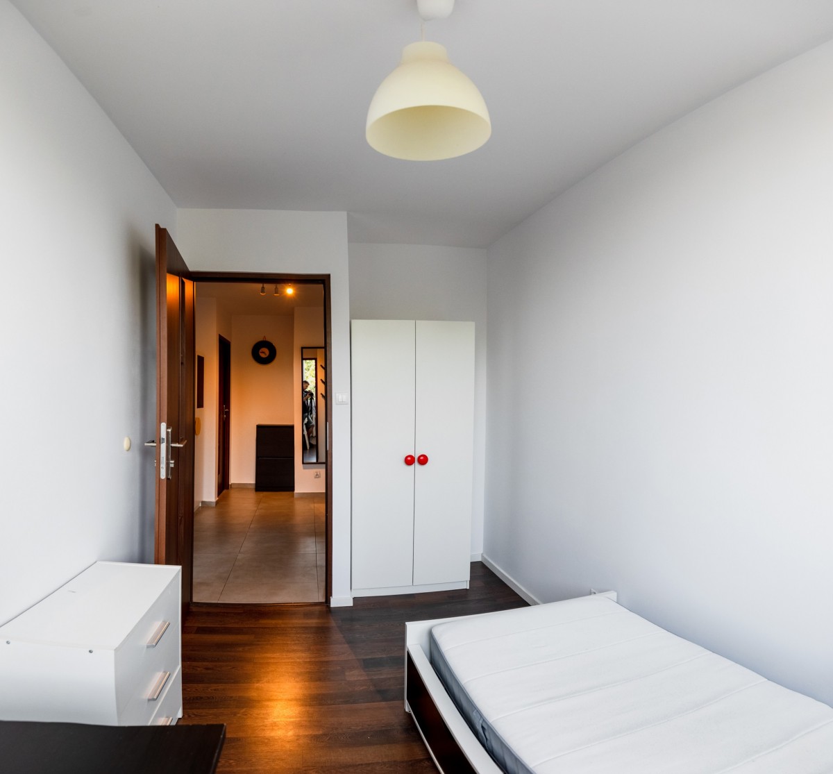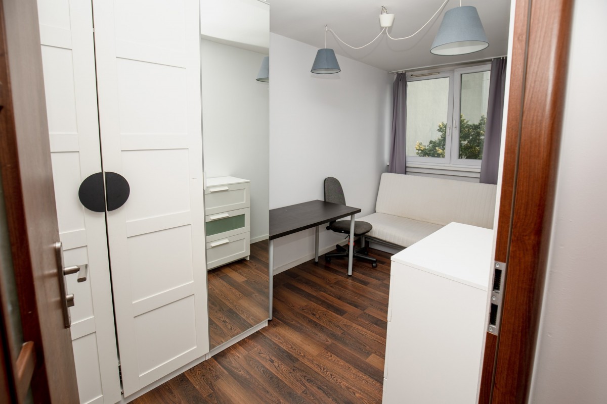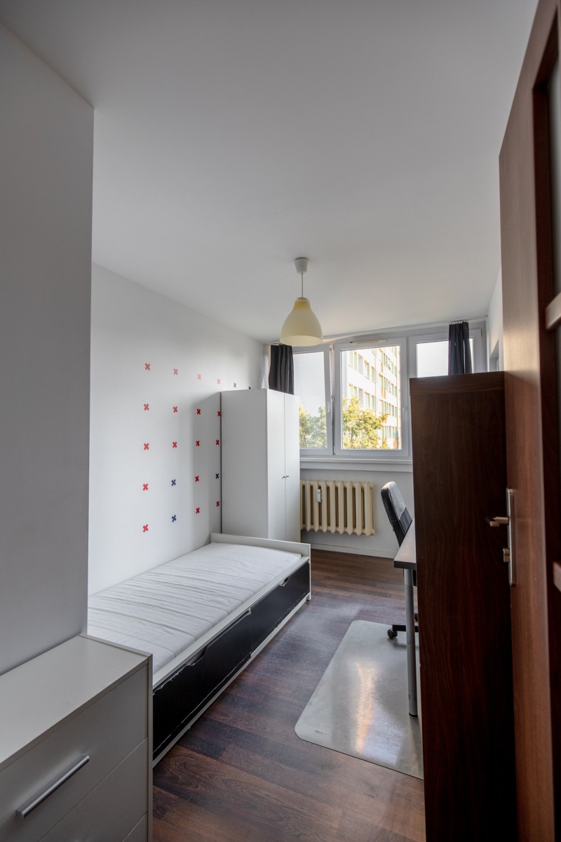 Pełne wyposażenie Trzy pokoje wyposażone są w praktyczne meble: łóżko z szufladami, szafę, regał, biurko, komodę i stolik. Czwarty pokój oferuje jeszcze więcej przestrzeni z dużą 3-drzwiową szafą, obszerną komodą i rozkładaną wersalką dla dwóch osób. W mieszkaniu znajduje się również pralka, lodówka, kuchenka elektryczna z piekarnikiem, mikrofalówka, kompletna zabudowa kuchenna, łazienkowa oraz dwie szafki na buty w przedpokoju. Dodatkowo wyposażenie obejmuje sztućce, naczynia, garnki, szklanki, suszarkę, odkurzacz i czajnik.