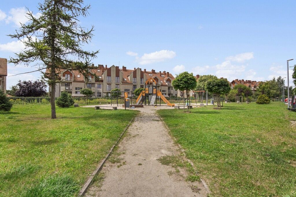 Ciche i spokojne osiedle otoczone zielenią z placem zabaw dla dzieci, zamykaną bramą wjazdową i parkingiem dla mieszkańców.