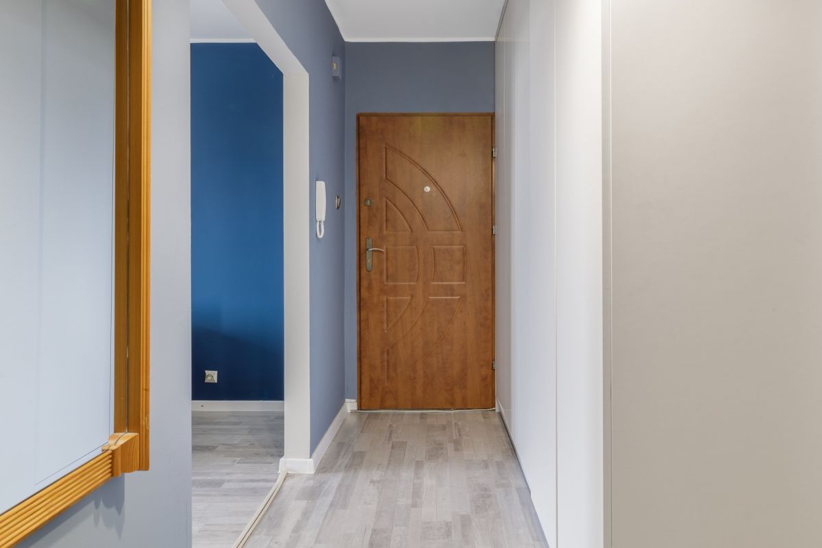 Długi korytarz będzie idealnym miejscem na obrazy, wieszaki lub zdjęcia. Tutaj mamy dużą przesuwną szafę, która pomieści nie tylko okrycia wierzchnie.