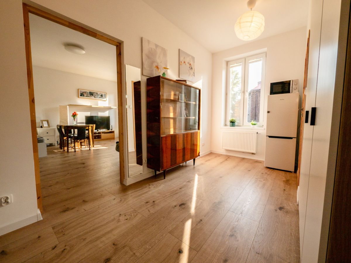 Mieszkanie o powierzchni 44 m², położone na 2. piętrze kamienicy z centralnym ogrzewaniem. Lokal przeszedł remont i utrzymany jest w bardzo dobrym standardzie - wszystkie sprzęty są nowe, a przestrzeń została zaplanowana w sposób logiczny i wygodny.
