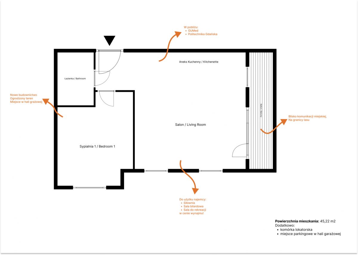 45,22 m² | strefa fitness | sala bilardowa | blisko Centrum i Wrzeszcza | pełne AGD w zabudowie | sypialnia z wygodnym łóżkiem 160 x 200 cm | balkon | komórka | hala garażowa | w pobliżu GUMed oraz Politechnika Gdańska