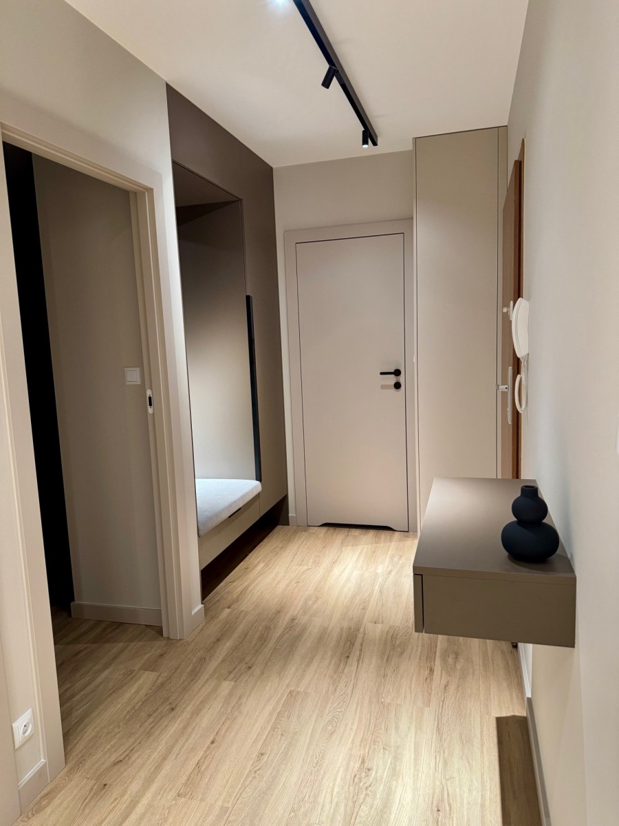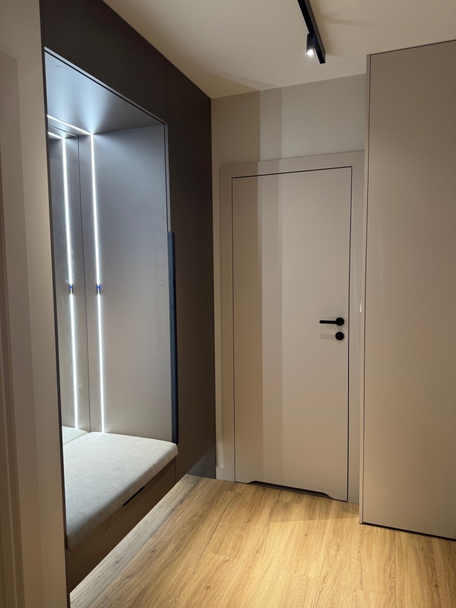 • Przedpokój z zabudowaną szafą garderobianą z dużym siedziskiem tapicerowanym oraz dużym lustrem