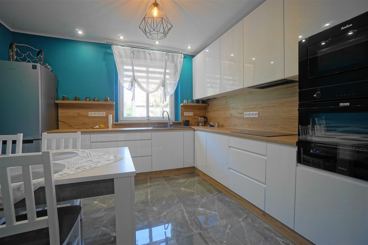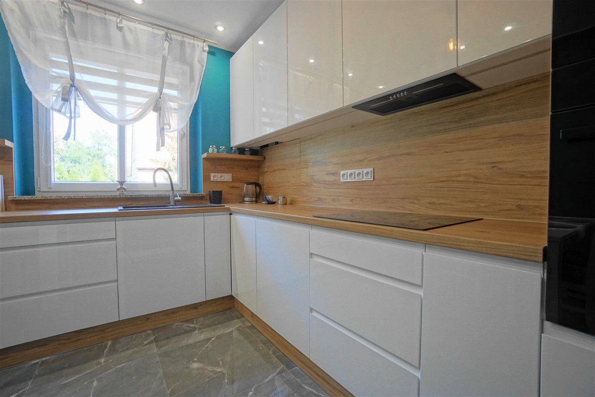 - Dużej kuchni (stół, 4 krzesła, płyta indukcyjna, zmywarka, piekarnik parowy, mikrofalówka, lodówka, duża ilość szafek, blat roboczy)