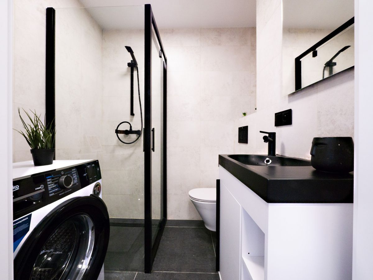 łazienka z prysznicem i WC, wyposażona w nową pralkę,