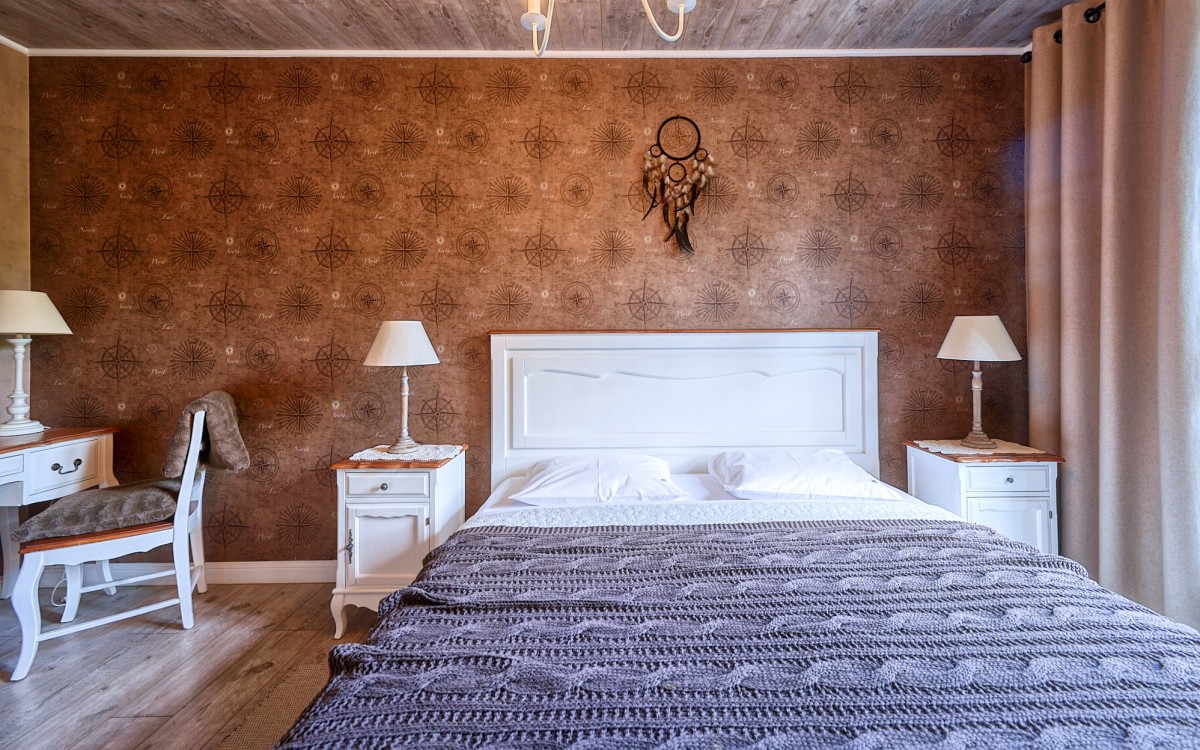 Sypialnia - stylowe drewniane meble, podwójne łóżko, wzorzyste tapety