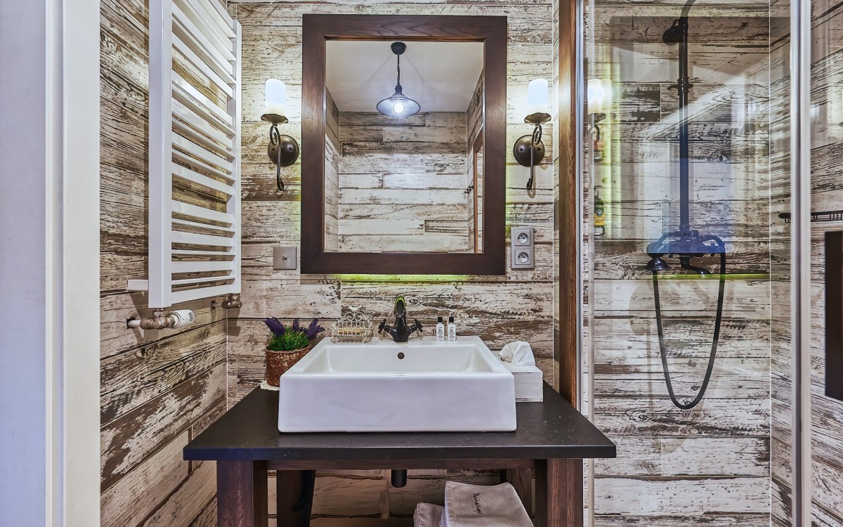 Łazienka - w norweskim, klimatycznym stylu z dużym prysznicem, toaletą oraz umywalką