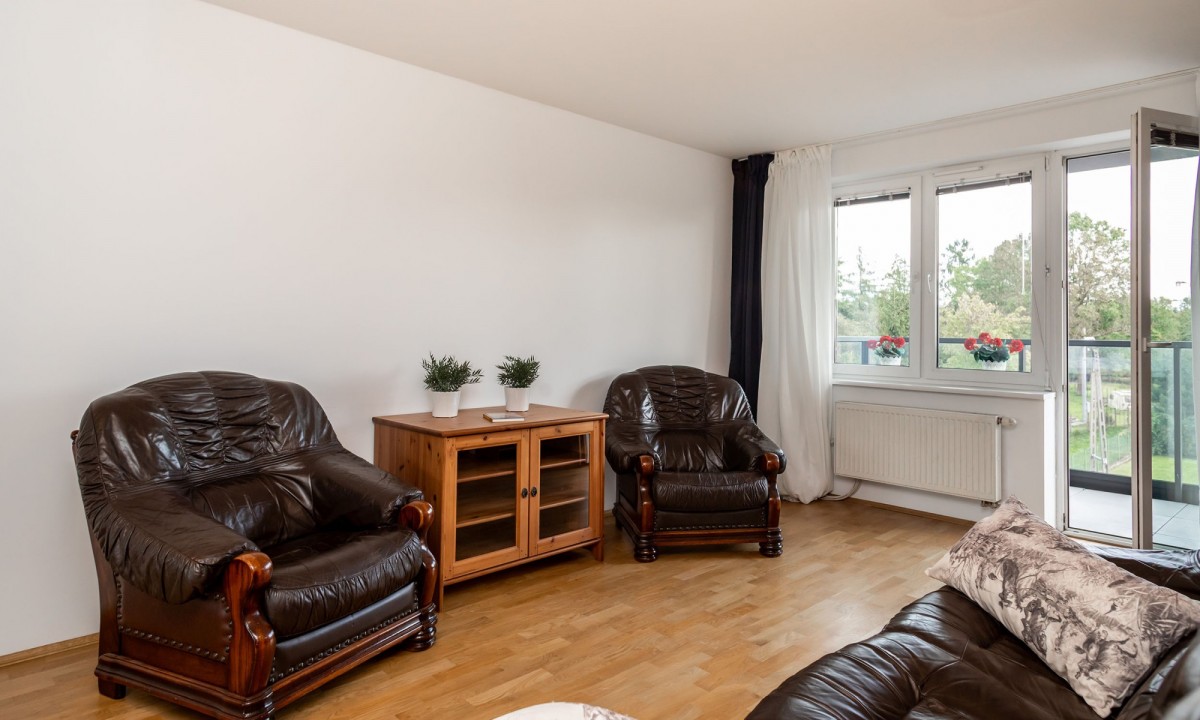 - przestronny salon z wyjściem na balkon z widokiem na zieleń, oraz przejściem do kuchni,