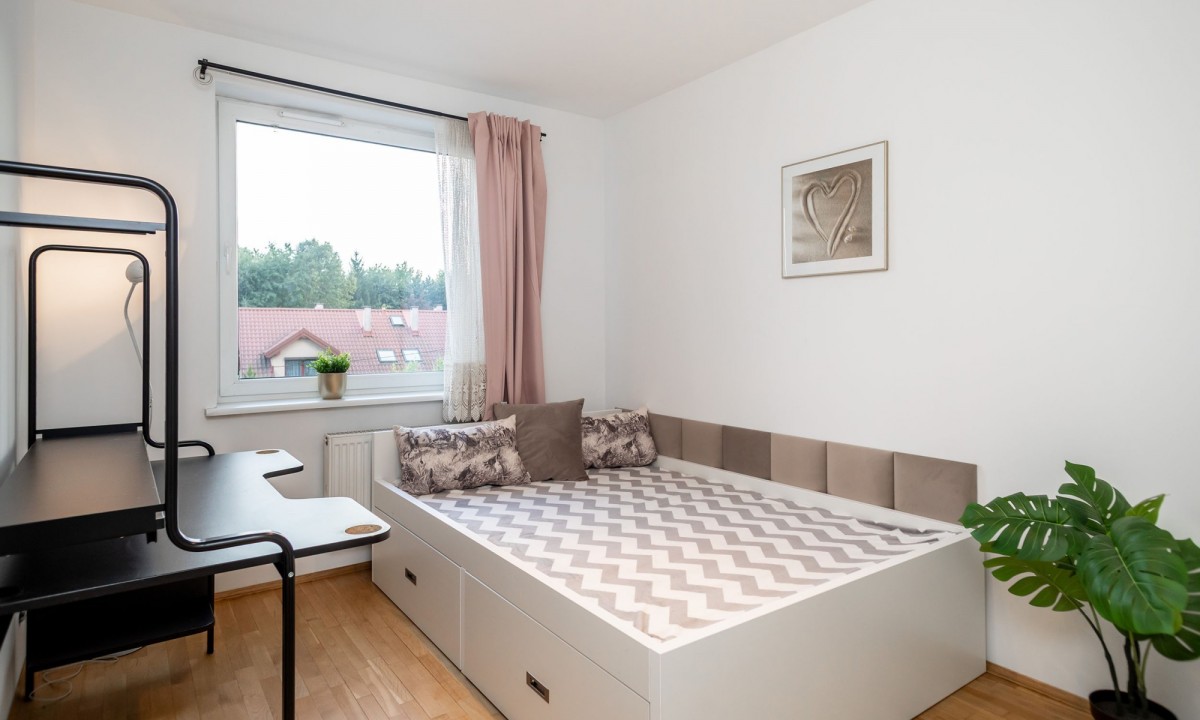 - jasna sypialnia z miejscem do pracy i dużym łóżkiem,