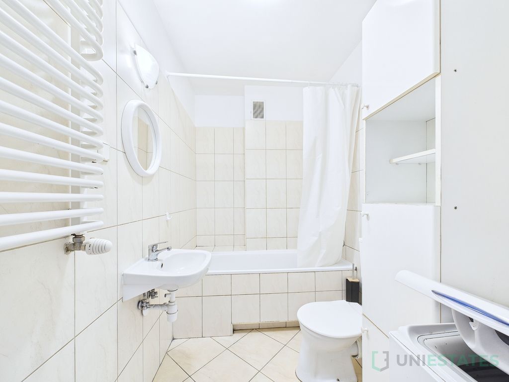 - bathroom with bathtub, washbasin, toilet and washing machine.