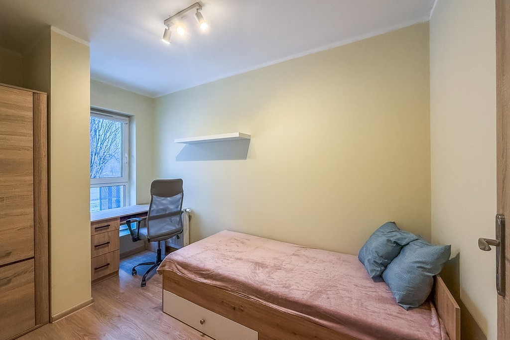 Mieszkanie jest nowo wykończone, z oknami wychodzącymi na południe, co zapewnia dużo naturalnego światła. Składa się z dwóch niezależnych pokoi, wspólnego przedpokoju, z aneksem kuchennym oraz łazienki połączonej z wc. Każdy z pokoi jest wyposażony w wygodne łóżko z materacem, szafę oraz biurko do nauki. Na ścianach gładzie na podłodze położono panele. Wysokość pomieszczeń to 260 cm.