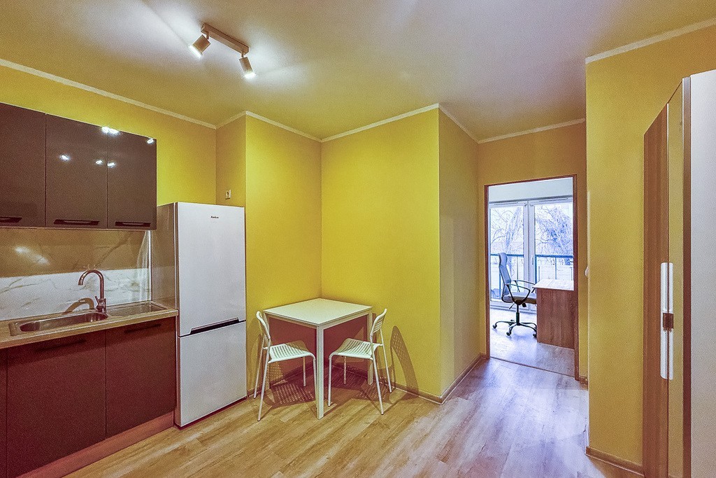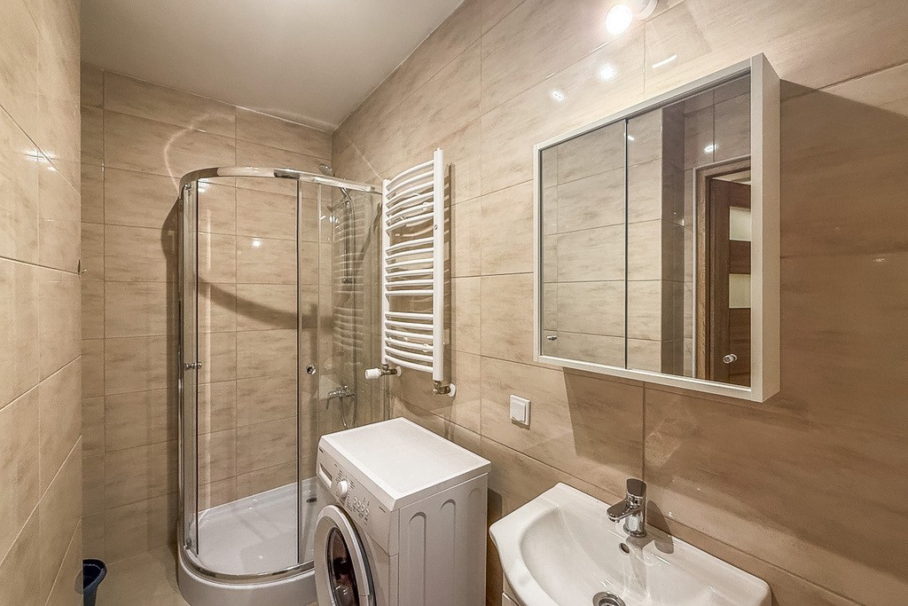 Wspólna przestrzeń w przedpokoju połączonym z kuchnią daje możliwość spędzania razem czasu przy posiłku. Łazienka z WC wyposażona w pralkę, prysznic, umywalkę oraz grzejnik drabinkowy. Mieszkanie zostało dopiero co wykończone do pierwszego najmu.