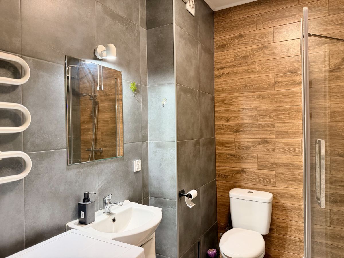 Mieszkanie składa się z przytulnego pokoju z aneksem kuchennym, strefą sypialnianą, przestrzenią do jedzenia, łazienki z prysznicem, a także garderoby. Dodatkowym atutem jest duży balkon.
