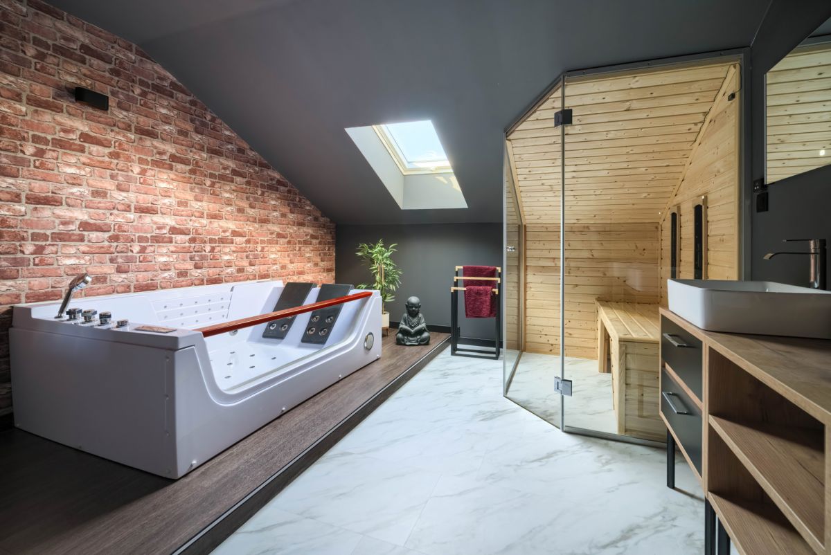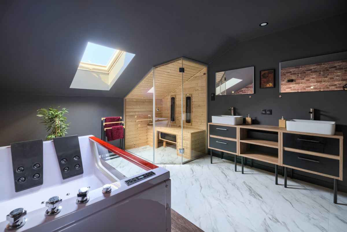 - Luksusowa łazienka - połączenie sauny i jacuzzi w jednym dużym pomieszczeniu, idealne na odprężający wieczór, własne prywatne SPA.