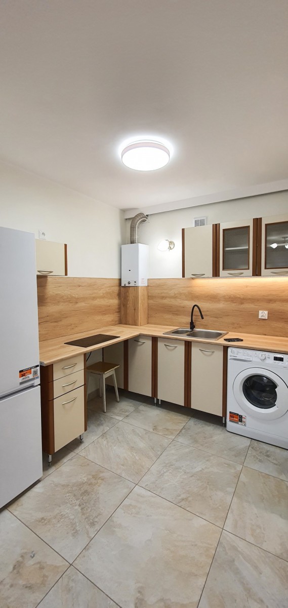 Kuchnia jest w pełni umeblowana i wyposażona w sprzęt AGD: lodówkę, płytę grzewczą, zlew oraz pralkę. W łazience nowoczesna kabina prysznicowa, estetyczna glazura i szafka z umywalką. W pokojach zadbane podłogi, świeżo odmalowane ściany oraz nowe oświetlenie.