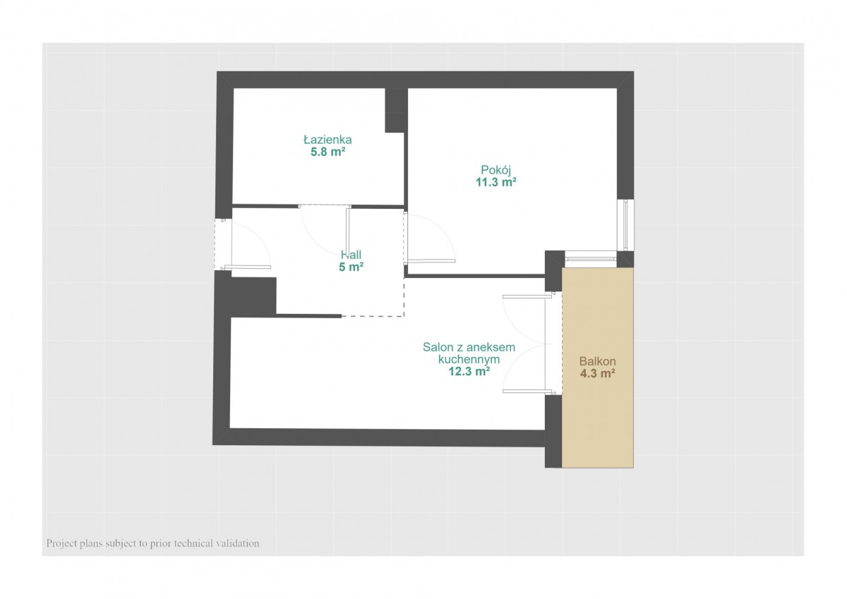 Układ mieszkania: salon z aneksem kuchennym, sypialnia, łazienka z toaletą.