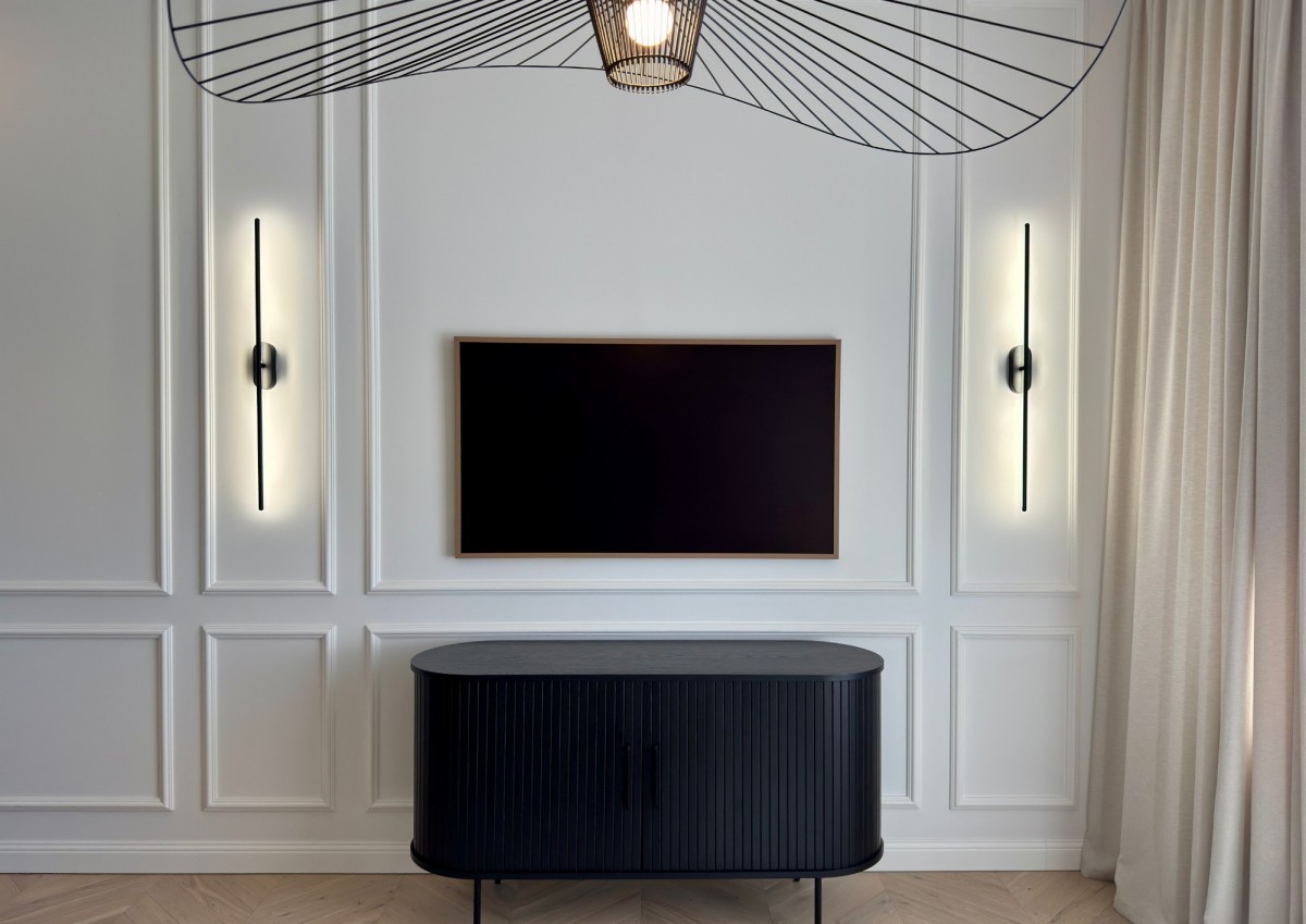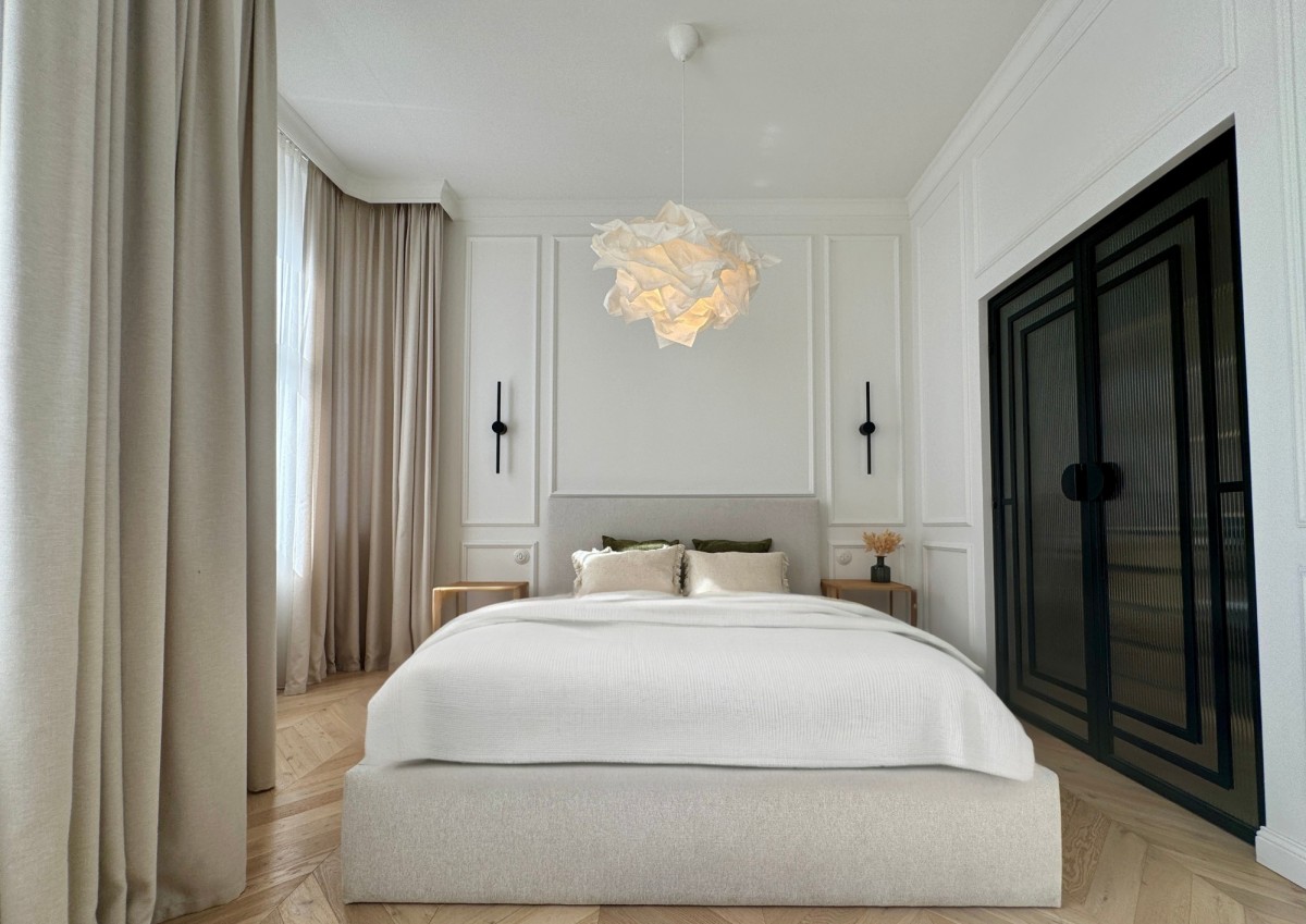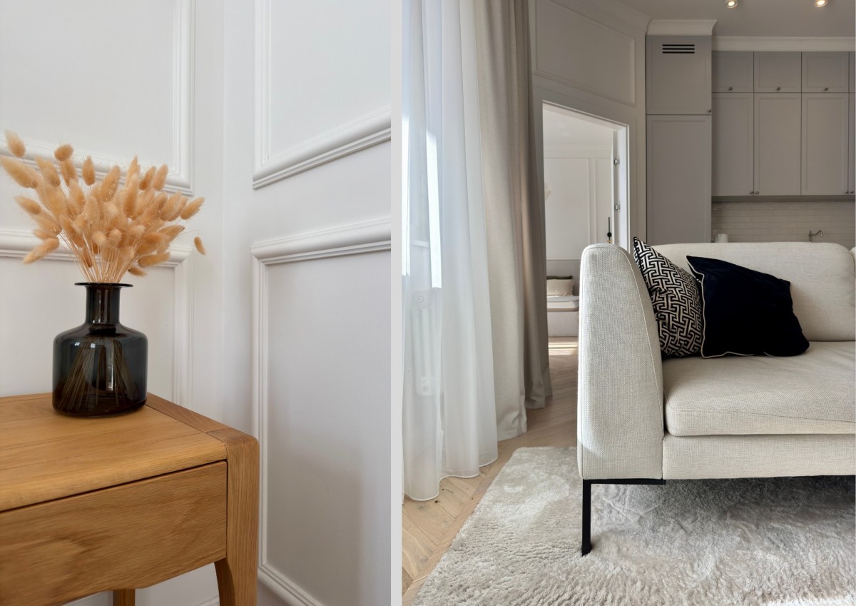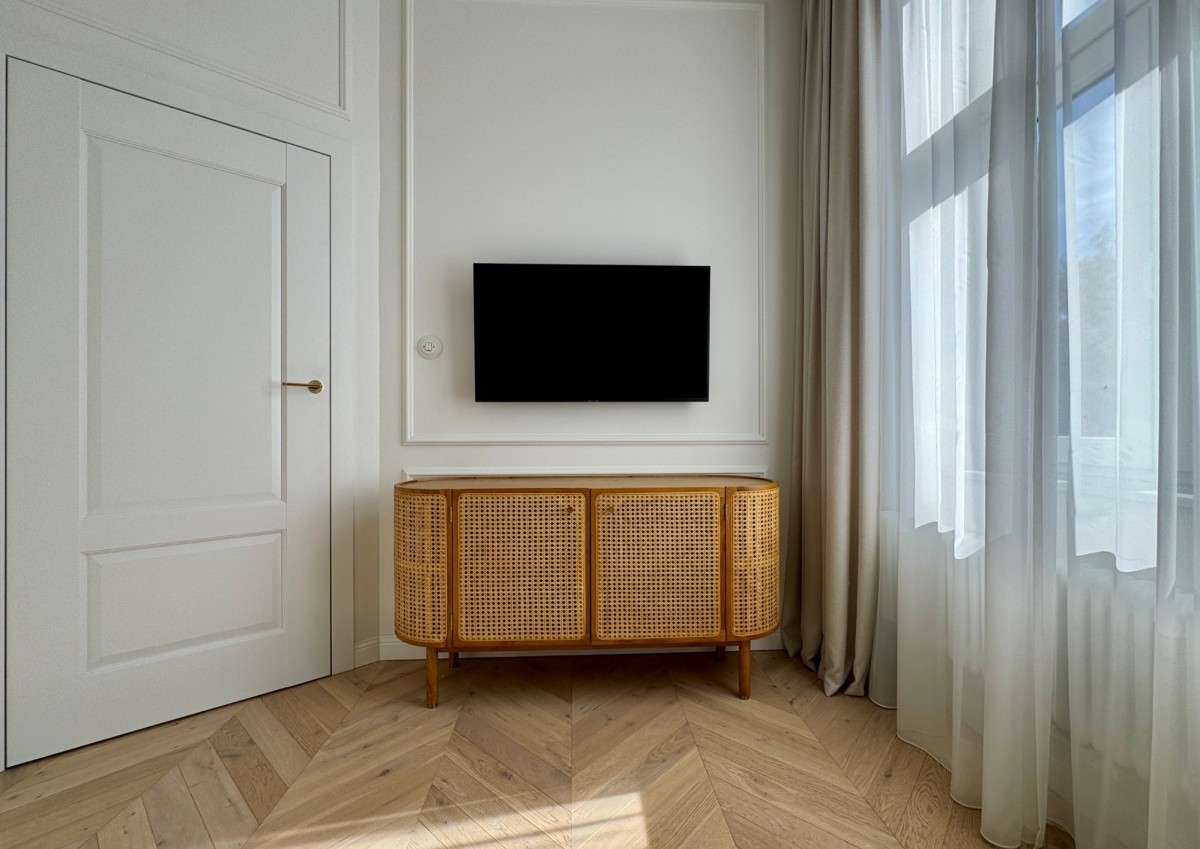 Mieszkanie utrzymane jest w jasnej kolorystyce. Przepiękna podłoga ułożona w klasyczną jodełkę oraz stylowe dodatki — lampy, dywan, długie zasłony — tworzą przytulny, kameralny klimat. Wnętrze jest spójne i starannie zaprojektowane.