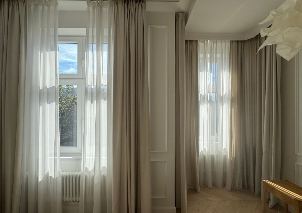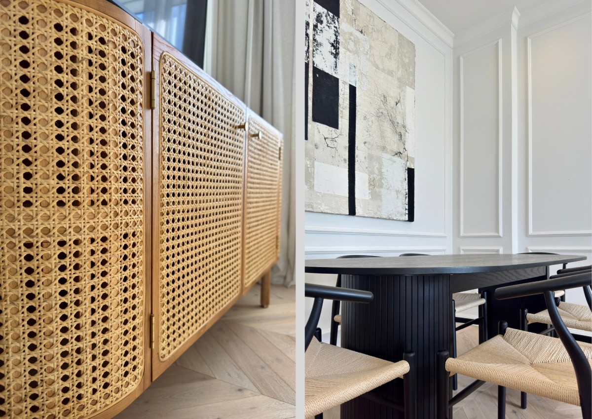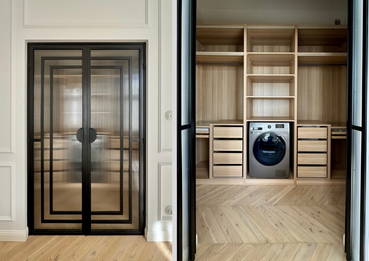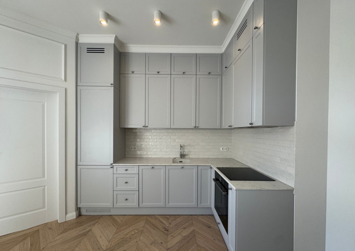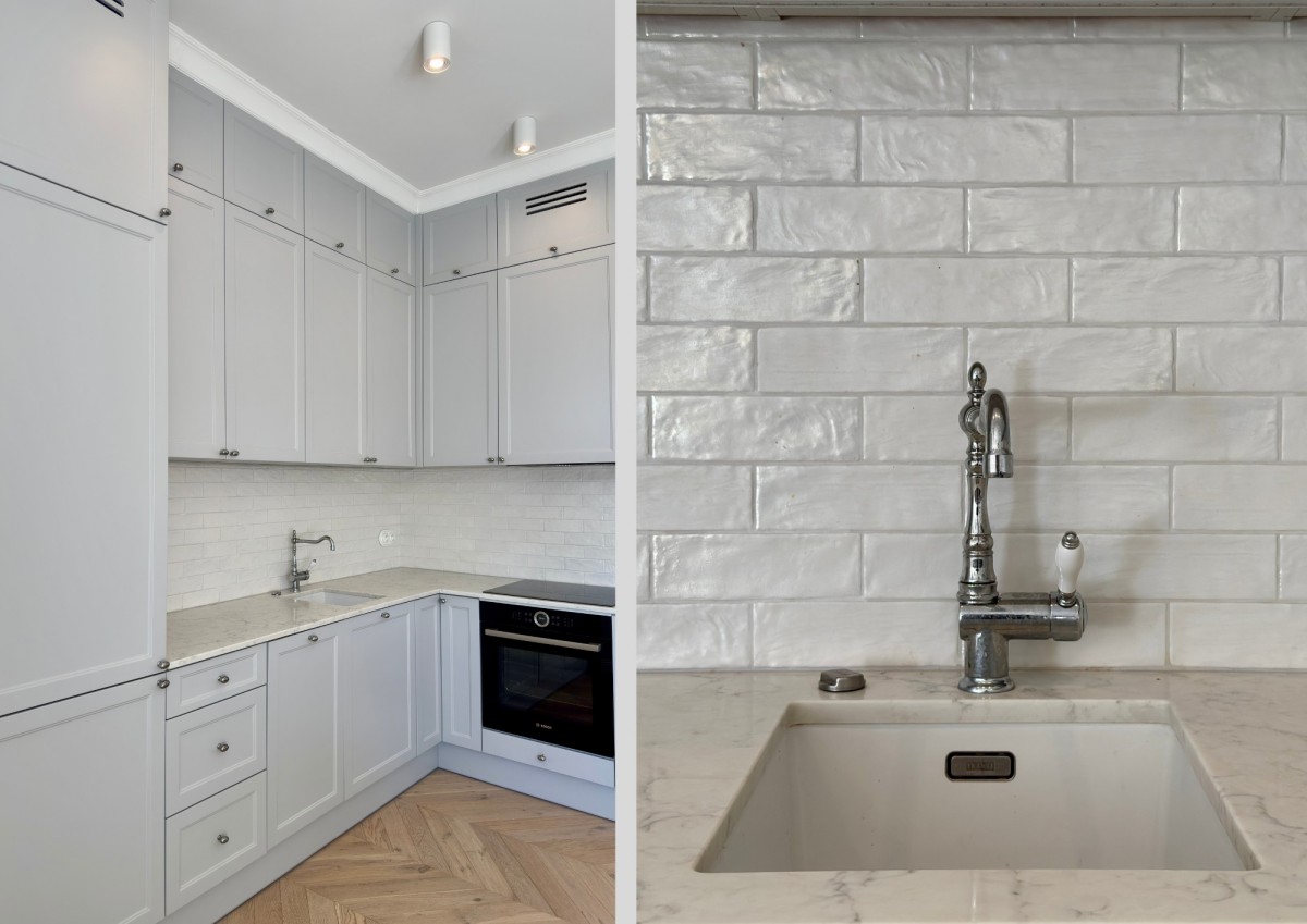 Mieszkanie utrzymane jest w jasnej kolorystyce. Przepiękna podłoga ułożona w klasyczną jodełkę oraz stylowe dodatki — lampy, dywan, długie zasłony — tworzą przytulny, kameralny klimat. Wnętrze jest spójne i starannie zaprojektowane.