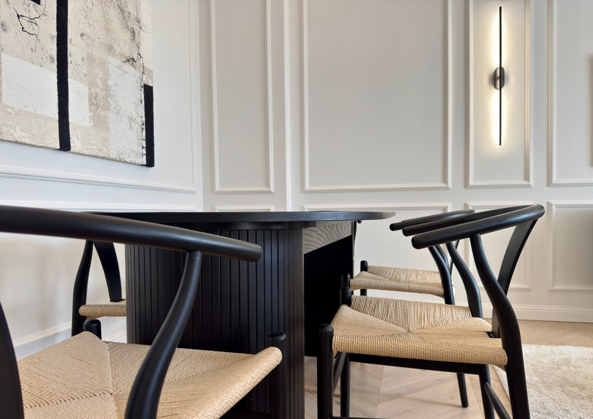 Salon z kuchnią - serce mieszkania. Przestronne i idealnie doświetlone dzięki południowej ekspozycji. Wygospodarowano tu miejsce na duży stół z sześcioma krzesłami, wygodną sofę, stoliki kawowe oraz TV. Zabudowa meblowa w kuchni wykonana jest aż pod sam sufit, dzięki czemu mamy tu sporo miejsca do przechowywania.