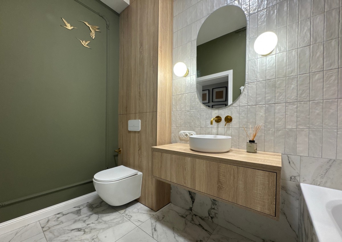 Łazienki - usytuowanej tuż po prawej stronie od wejścia. Przytulna, wykończona w jasnej kolorystyce, której charakter podkreśla ściana w kolorze butelkowej zieleni.