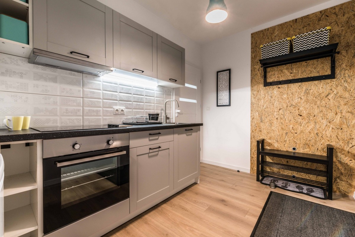 - meble kuchenne w zabudowie z płytą elektryczną i lodówko-zamrażarką;