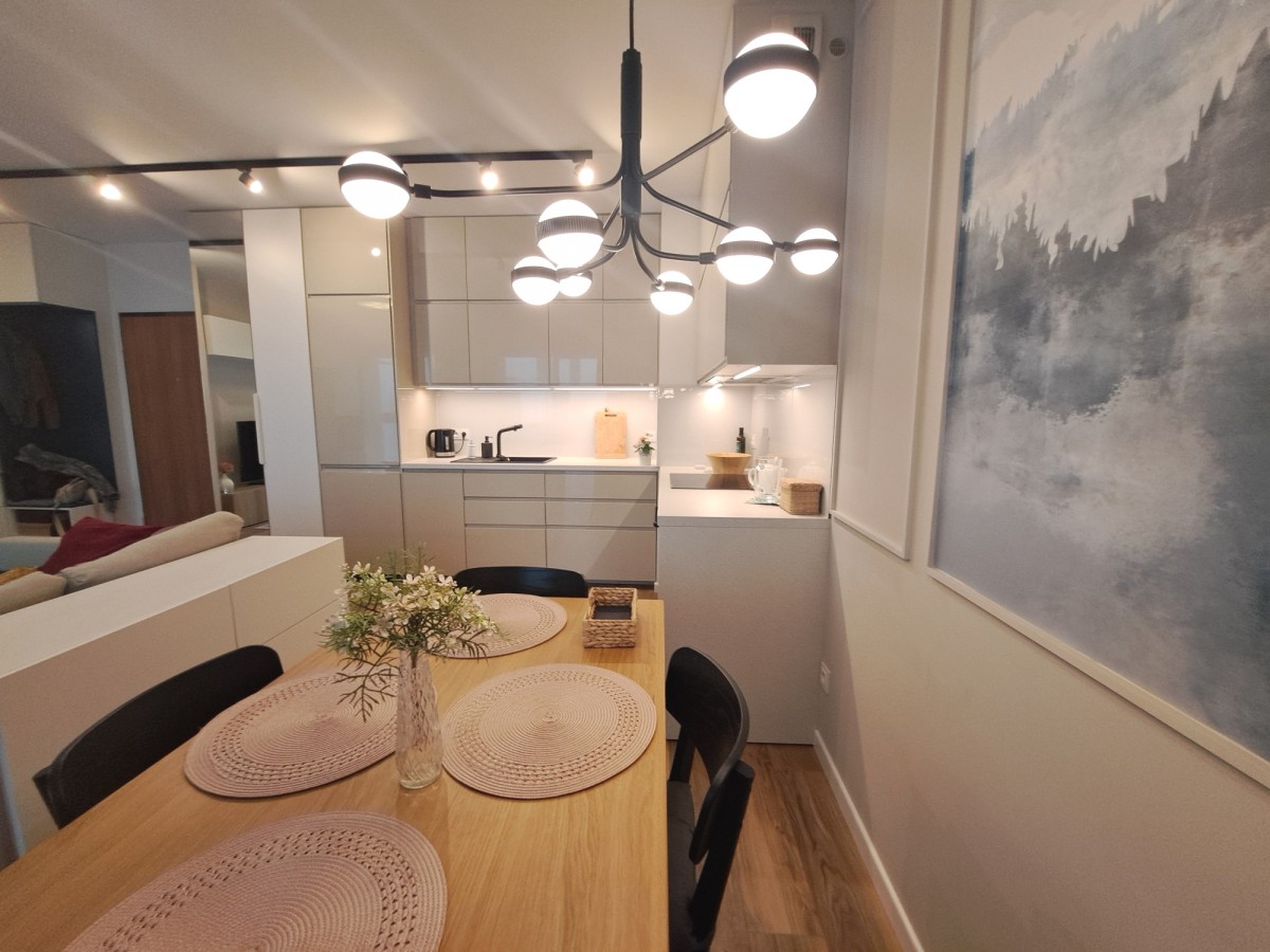 Kuchnia umeblowana - meble w zabudowie wysokiej klasy, sprzęt AGD: lodówka,zmywarka, okap, płyta, piekarnik , stół z krzesłami.