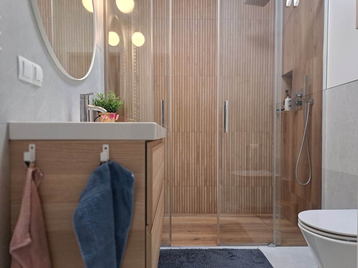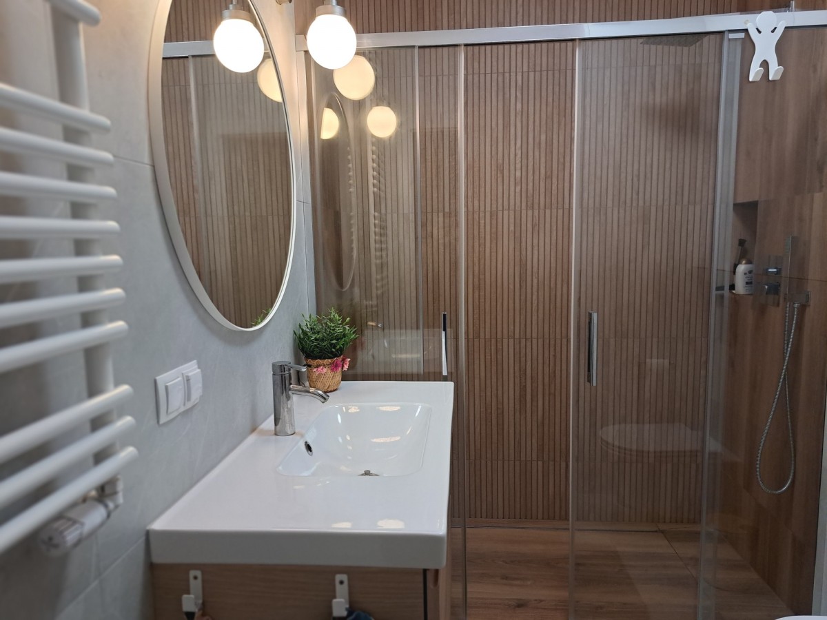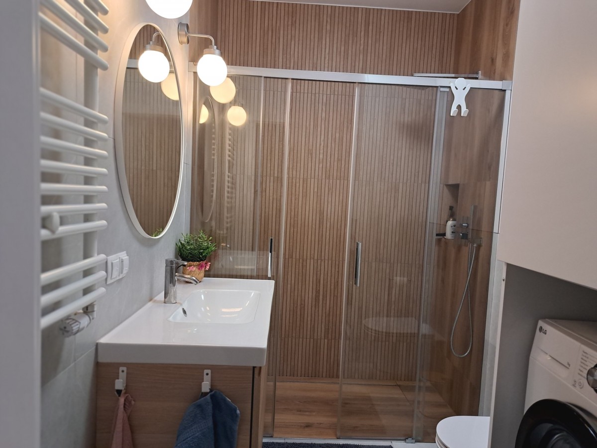 Łazienka gustownie urządzona w ładnych kafelkach z dużą kabiną prysznicową, jest pralka.