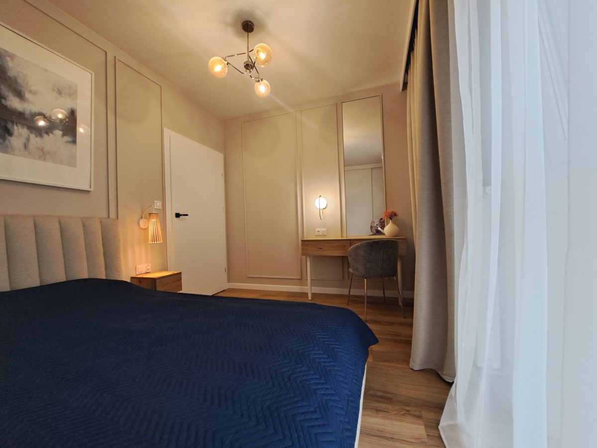 Sypialnia z zamykaną garderobą , na wyposażeniu: łóżko dwuosobowe, stoliki nocne, toaletka, lustro.