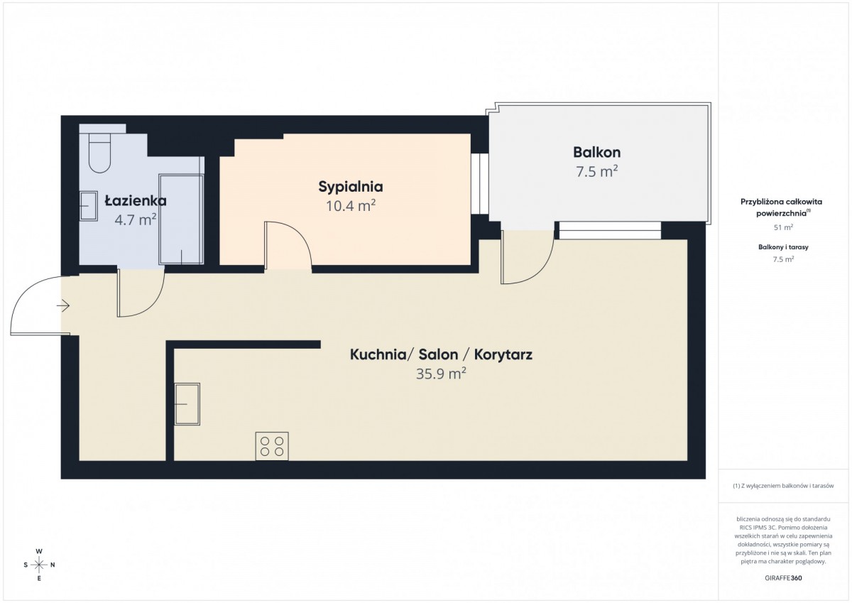 Nieruchomość składa się z pokoju dziennego z aneksem kuchennym, sypialni, łazienki oraz przedpokoju.