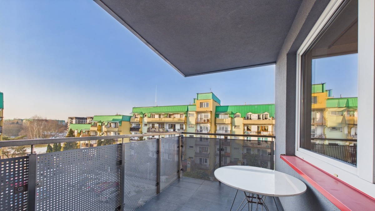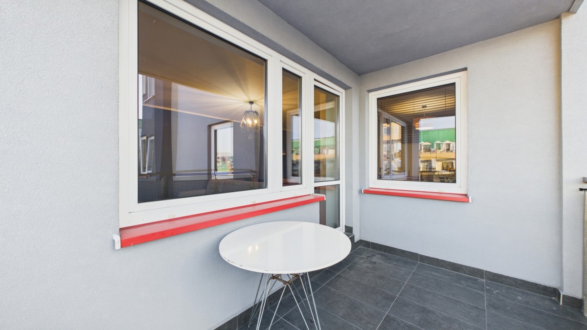 Relaks na zewnątrz: Prawdziwym atutem jest olbrzymi, zadaszony balkon - idealne miejsce na poranną kawę lub wieczorny odpoczynek bez względu na pogodę.