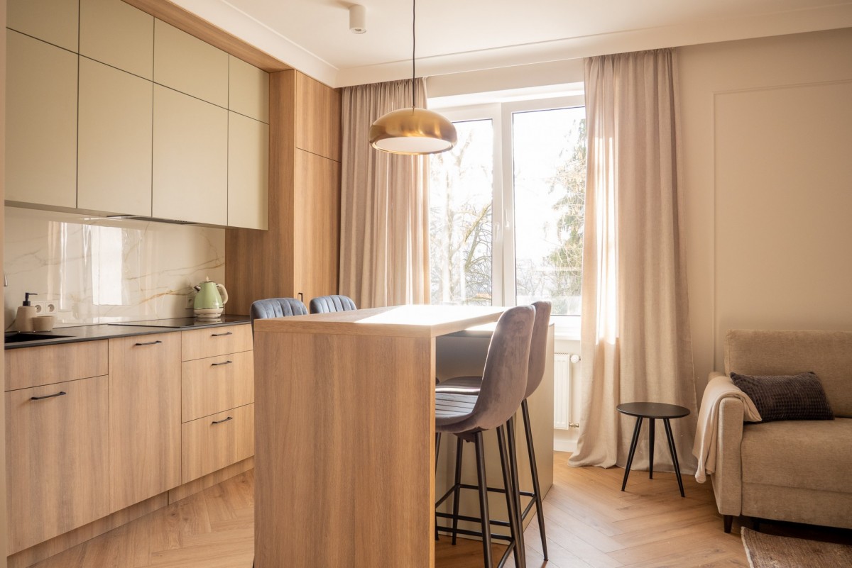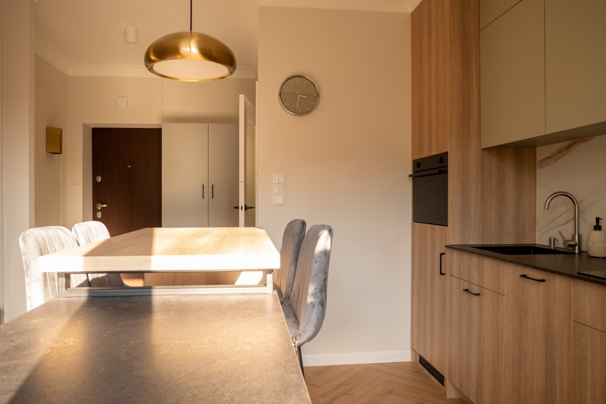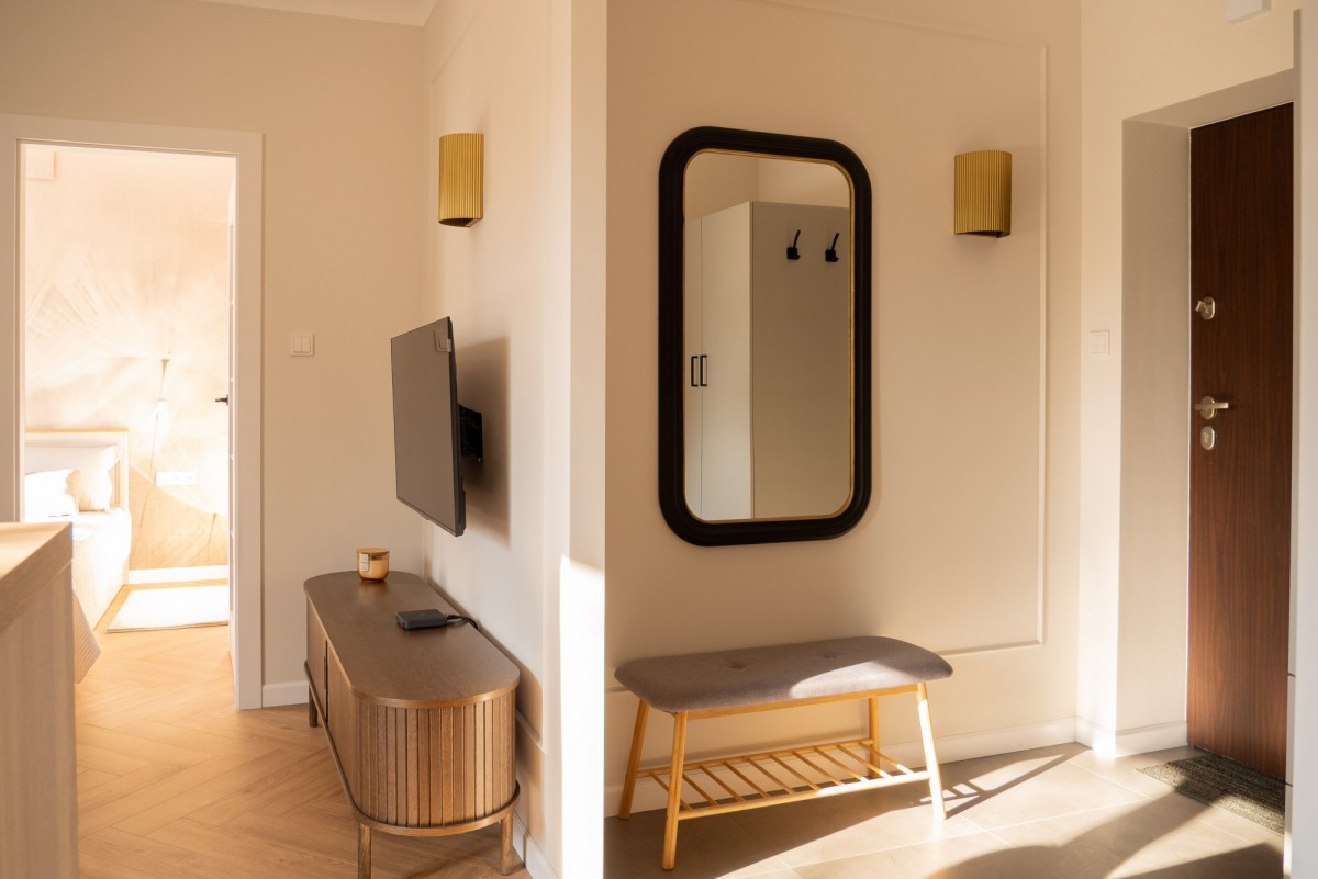 Stosunkowo niewielka powierzchnia mieszkania została funkcjonalnie zaprojektowana i wykończona z dbałością o każdy szczegół, tak aby stać się domem dla singla lub pary. Zadbano też o znaczną ilość miejsca do przechowywania.