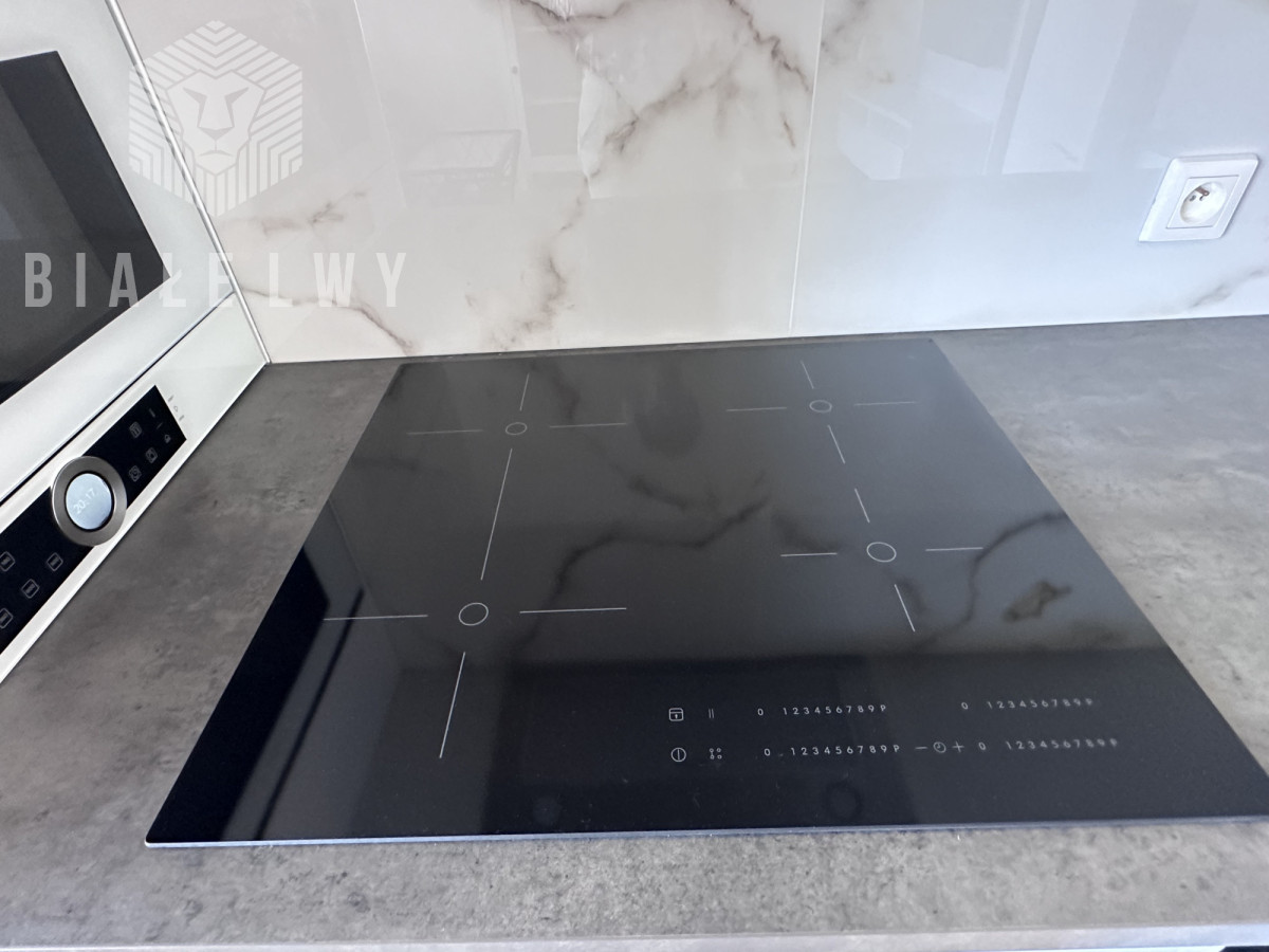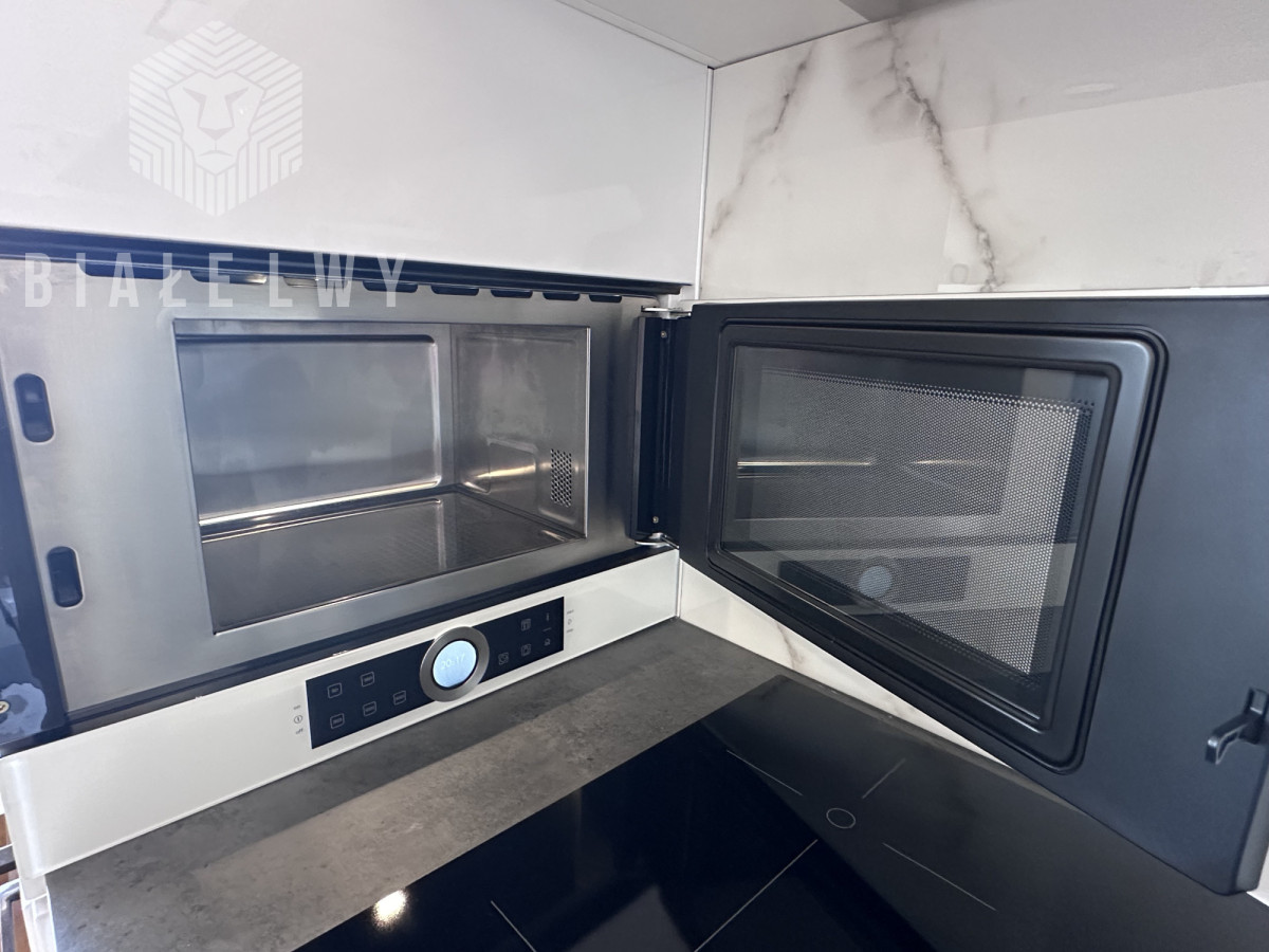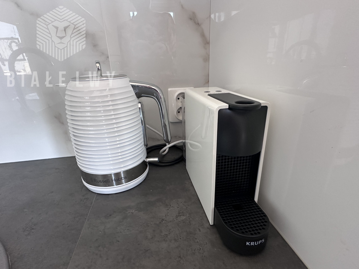 Kuchnia wyposażona w dużą lodówkę, płytę indukcyjną, okap, piekarnik, czajnik, ekspres, mikrofalę, naczynia.