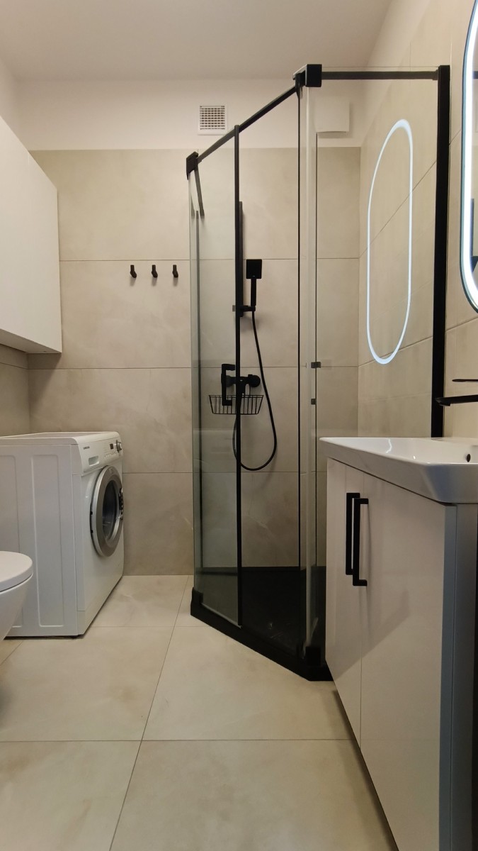 Łazienka: prysznic, pralka, grzejnik elektryczny.