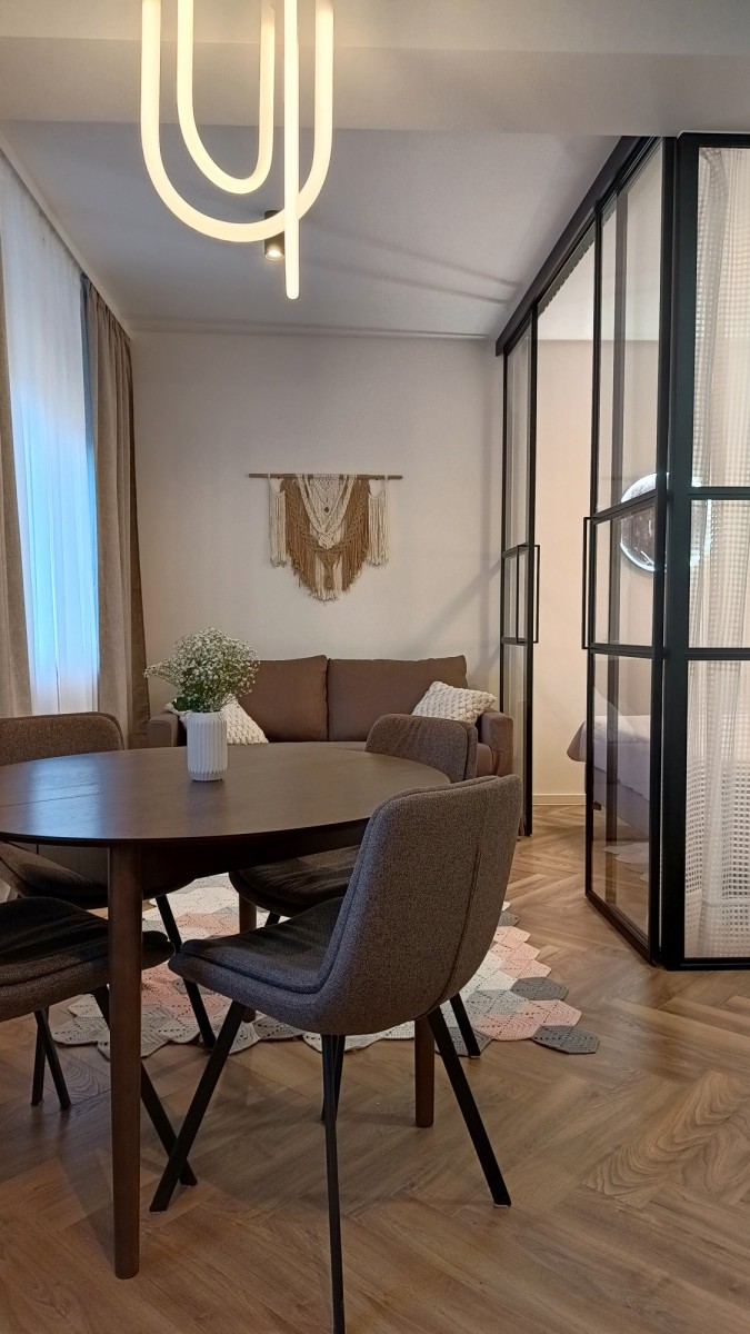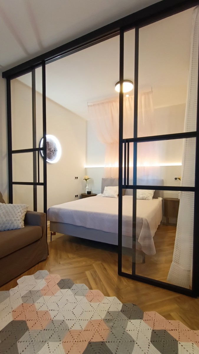 Apartament składa się z salonu z kuchnią, łazienki z prysznicem i nowoczesnej sypialni w stylu loft - przeszklonej, z dużym łóżkiem King Size. Apartament jest w pełni umeblowany i wyposażony. Wszystko jest NOWE.