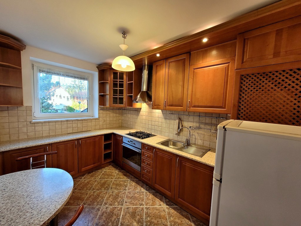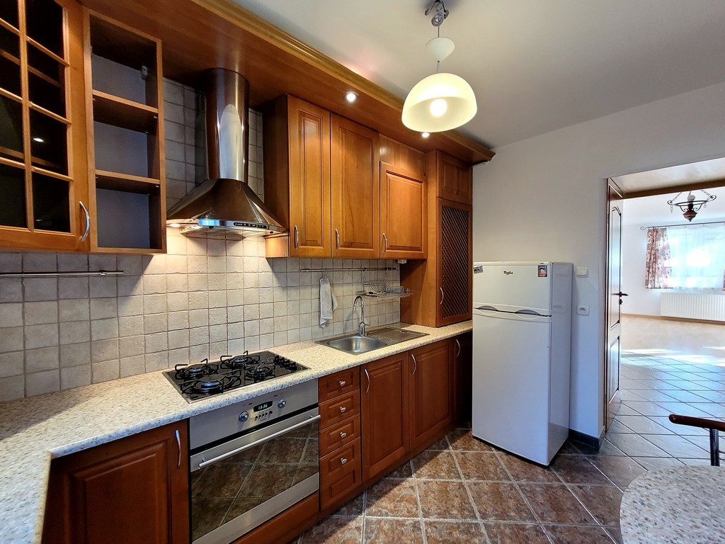 - Osobna, widna kuchnia: w pełni umeblowana i wyposażona w sprzęt AGD (płyta gazowa, piekarnik, okap).